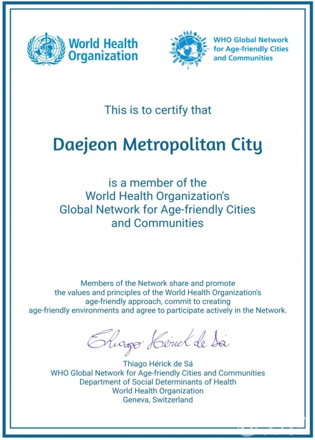 안용호 대전시 노인복지과장은 “국제네트워크 가입 인증에 만족치 않고 제주특별자치도의 추진 사례와 노인정책 관련 전문가들의 고견을 바탕으로 대전시만의 고령 친화 정책을 발굴해 노인뿐만 아니라 모든 세대가 살기 좋은 대전을 만들어 가겠다”고 말했다.