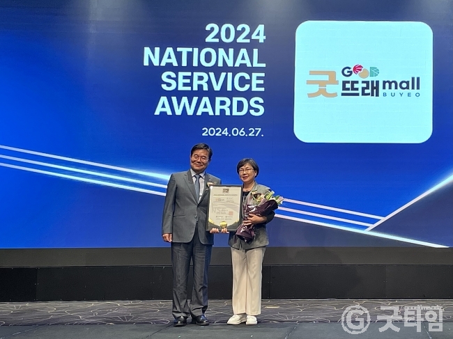 [굿타임] = 이강부 기자 = 부여군의 공식 농특산물 온라인 쇼핑몰 굿뜨래몰이 산업정책연구원이 주최하는 2024년 국가서비스대상(7th National Service Awards) 농특산물 쇼핑몰 부문에서 2년 연속 대상을 수상했다.