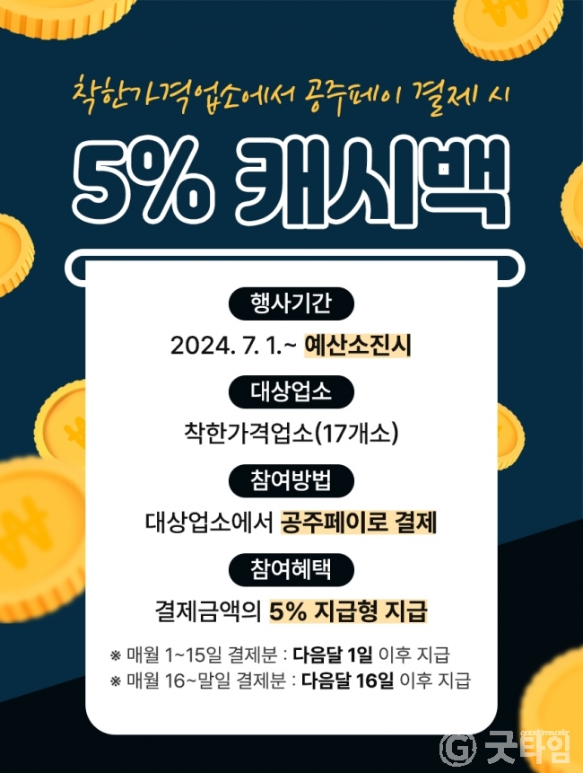 [굿타임] = 이강부 기자 = 공주시가 7월부터 착한가격업소에서 모바일 지역화폐인 공주페이로 결제할 경우 5% 추가 캐시백을 지원한다.