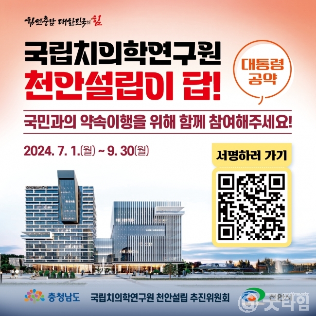 [굿타임] = 이강부 기자 = 충남도가 국립치의학연구원 천안 설립 대통령 공약 이행을 촉구키 위해 220만 도민의 의지를 모으는 서명운동에 본격 돌입했다.