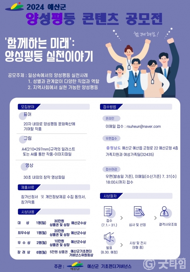 [굿타임] = 이강부 기자 = 예산군과 예산군기초젠더거버넌스는 양성평등 문화확산을 위한 홍보 정책 추진의 일환으로 2024년 예산군 양성평등 콘텐츠 공모전을 개최한다.