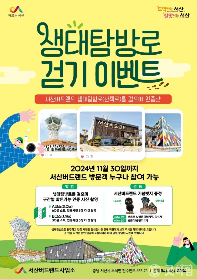 서산버드랜드 방문객이라면 기간중 누구나 참여할수 있으며 A, B 코스로 나뉜 생태탐방로의 지정 장소에서 인증 사진을 촬영하면 된다.
