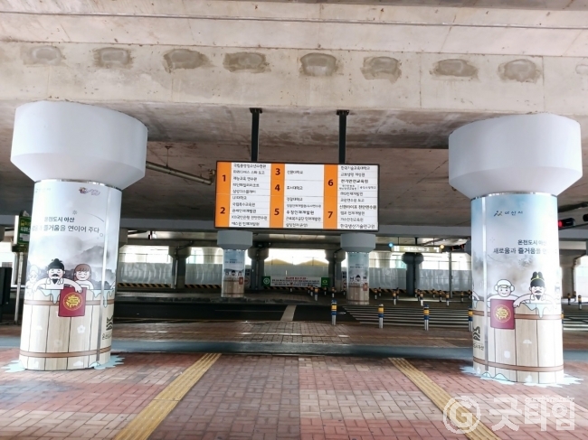 역 하부공간의 퇴색되고 낡은 회색 기둥에 단순한 관광지 소개를 넘어 아산의 정체성을 표현하는데 주력했으며 교각의 콘크리트에 손상이 없으면서 점검이 쉽도록 안전한 구조물 설치기법을 적용한 새로운 시도가 돋보인다.