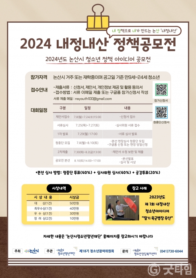 2024년 내정책으로 내가 만드는 논산 내정내산 공모전은 논산시에 거주커나 시 소재의 학교에 다니고 있는 9세부터 24세 청소년이면 누구나 참여 가능하며 개인 또는 4명 이내의 팀으로 지원하면 된다.