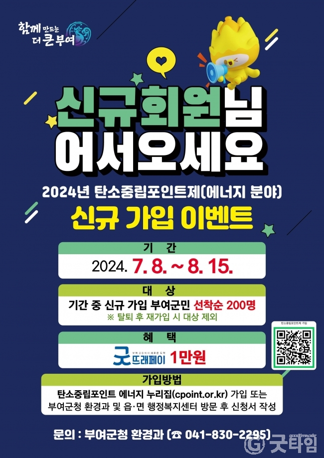 [굿타임] = 이강부 기자 = 부여군은 군민들의 일상속 탄소중립 실천문화를 확산시키고 탄소중립포인트제 운영 활성화를 위해 8월15일까지 탄소중립포인트제(에너지 분야) 신규가입 이벤트를 진행한다.