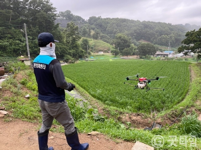 [굿타임] = 이강부 기자 = 공주시는 올해 총사업비 10억원을 투입해 5555ha를 대상으로 2회에 걸쳐 항공 공동방제를 실시한다.