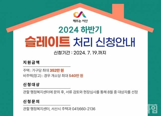 [굿타임] = 이강부 기자 = 서산시는 슬레이트 주택과 소규모 비주택을 대상으로 추진하는 2024년 하반기 슬레이트 처리 사업의 신청자를 19일까지 접수한다.