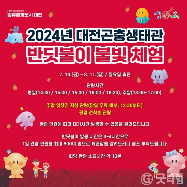 [굿타임] = 이강부 기자 = 대전시는 시민들에게 특별한 관람 서비스를 제공하고 곤충산업을 홍보키 위해 19일부터 내달 11일(월요일 휴관)까지 대전곤충생태관에서 반딧불이 불빛 체험전을 개최한다.