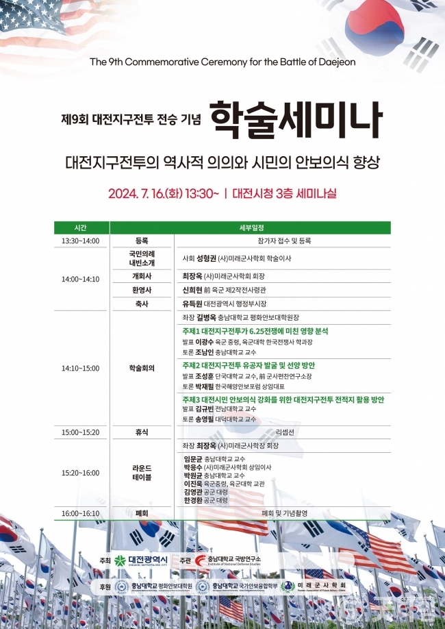 [굿타임] = 이강부 기자 = 대전시는 제9회 대전지구전투 전승기념식을 개최한데 이어 대전지구전투의 역사적 의의와 시민의 안보의식 향상을 주제로 학술 세미나를 개최했다.