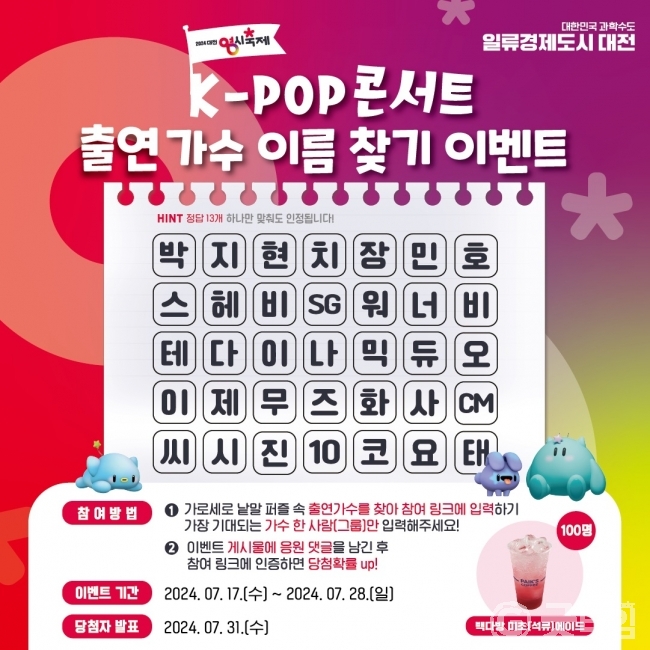 [굿타임] = 이강부 기자 = 대전시는 8월9일부터 열리는 2024 대전 0시 축제의 대표 프로그램인 K-POP 콘서트 출연 뮤지션중 시민들이 가장 보고 싶은 가수는 누구인지 알아보는 SNS 이벤트를 진행한다.