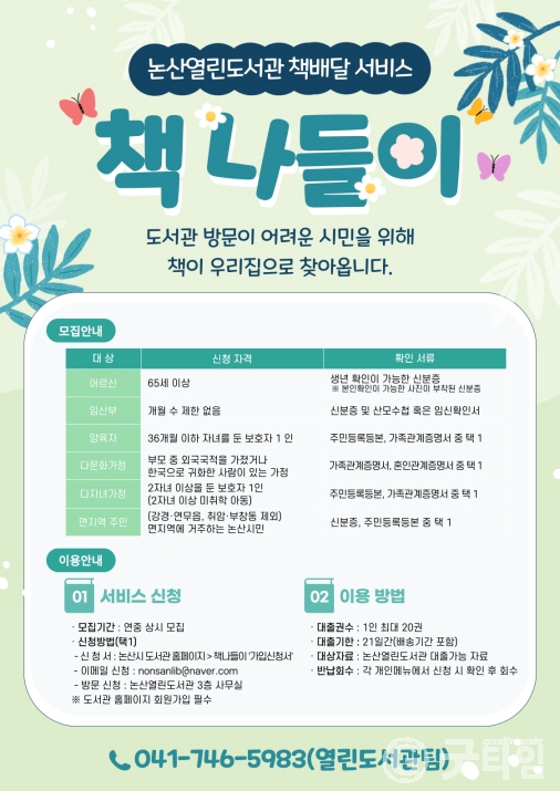 [굿타임] = 이강부 기자 = 논산시가 시민의 독서문화 진흥을 위해 운영중인 도서관 특성화 사업 책 나들이(책 배달 서비스)가 큰 호응을 얻고 있다.