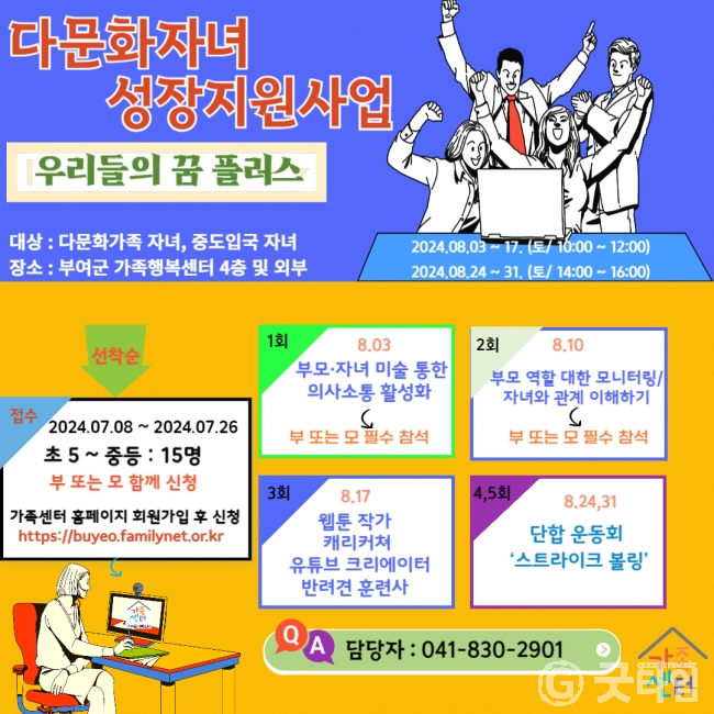 [굿타임] = 이강부 기자 = 부여군 가족센터는 오는 8월3일부터 31일까지 다문화가족 등을 대상으로 자녀 성장지원 사업인 우리들의 꿈 플러스 프로그램을 추진한다.