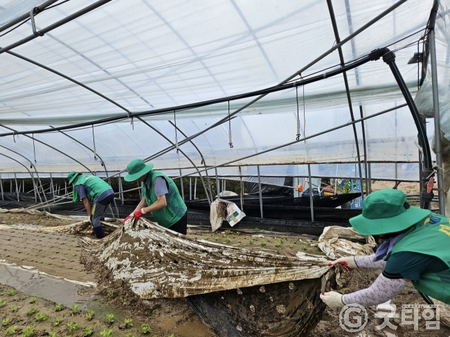 아산시새마을회 회장단과 회원 35명은 이른 아침부터 논산시 양촌면 농가를 찾아 침수된 비닐하우스 4동을 정리하고 주택의 가재도구를 밖으로 꺼내는 등의 작업을 진행했다.