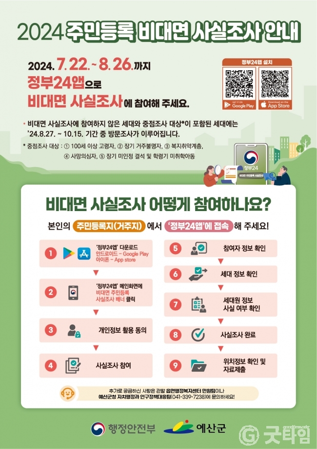 [굿타임] = 이강부 기자 = 예산군은 전군민을 대상으로 오는 11월18일까지 120일 동안 2024년 주민등록 사실조사를 실시한다.