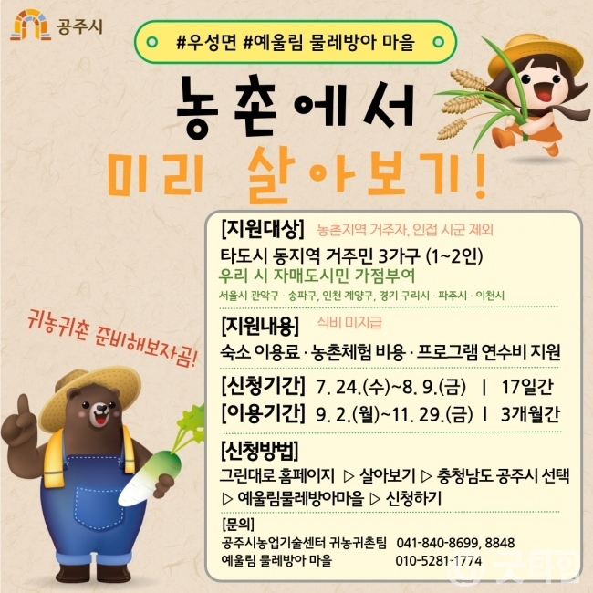 오병규 농촌진흥과장은 “귀농과 귀촌을 희망하는 도시민이 이 프로그램을 통해 농촌 생활을 충분히 경험하는 기회가 되시길 바라며 농촌에서 살아보기 프로그램을 통해 공주에 안정적으로 정착할수 있도록 사업 추진에 만전을 기하겠다”고 말했다.