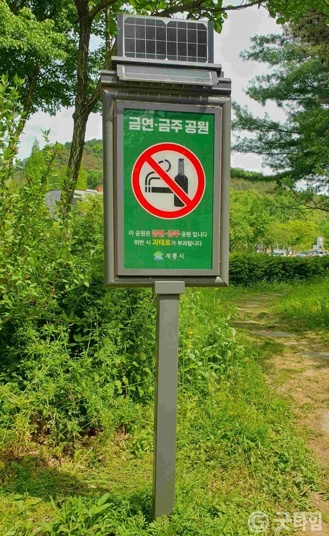 [굿타임] = 이강부 기자 = 계룡시는 간접흡연 피해 예방과 건전한 음주문화 조성을 위해 지역내 도시공원 14곳에 금연과 금주안내 태양광 LED 안내표지판을 설치했다.