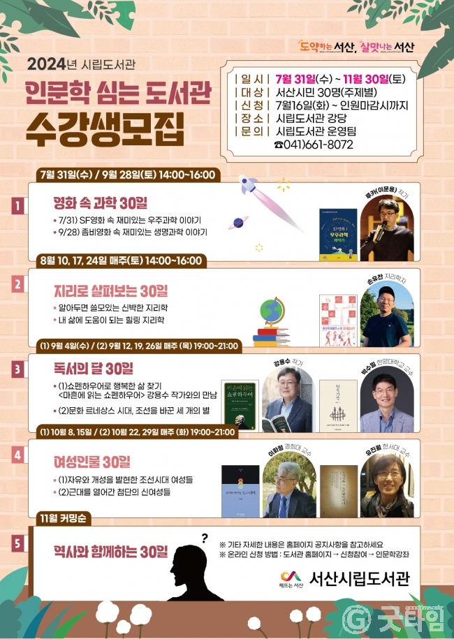 시는 서산시립도서관 강당에서 매월 특정한 주제를 선정해 맞춤형 특강을 제공하는 인문학 심는 도서관을 7월부터 12월초까지 운영한다.