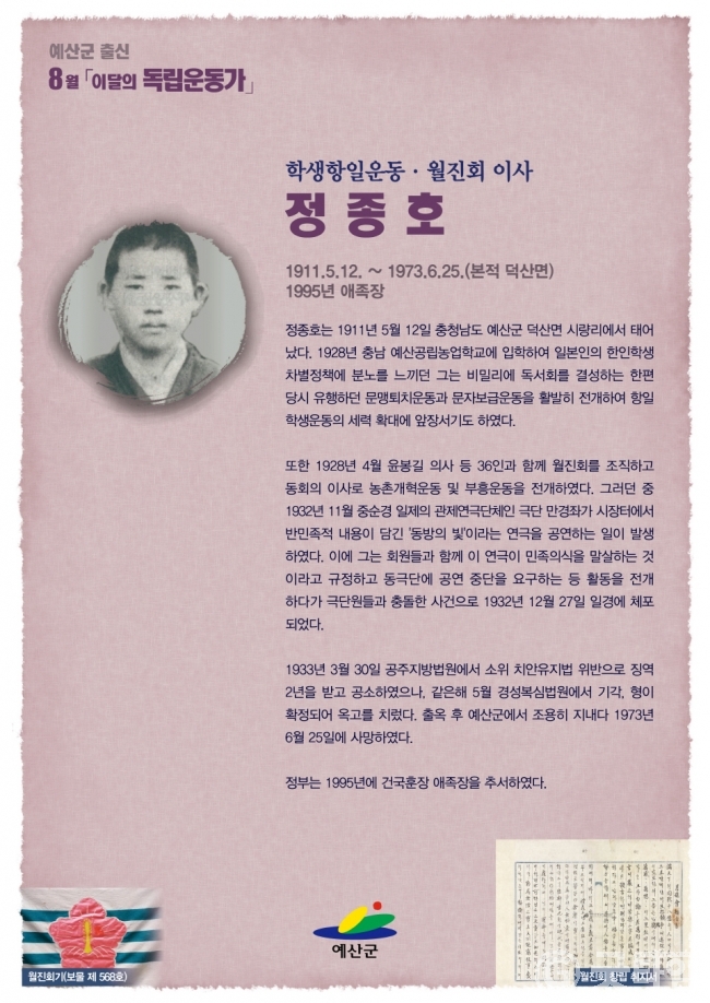 정종호는 1911년 덕산면 시량리에서 태어났으며 1928년 예산공립농업학교 재학중 일본인의 한인 학생 차별 정책에 분노를 느껴 비밀리에 독서회를 결성하고 문맹퇴치운동과 문자보급운동을 활발히 전개해 항일학생운동에 매진했다.