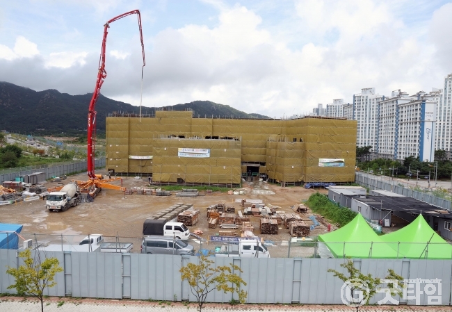 신청사는 현재 3층 난간 구조물과 철탑 콘크리트 타설을 마치며 30%의 공정률을 보이고 있다.