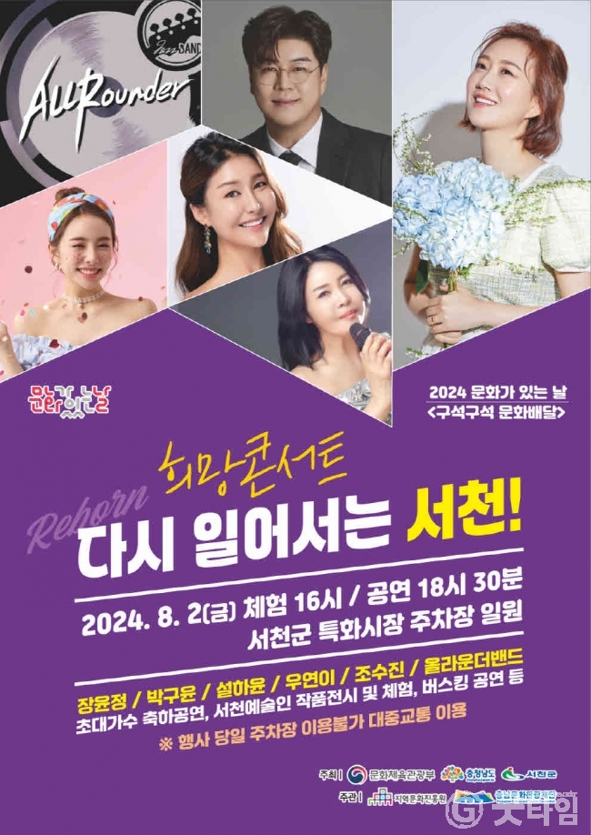 [굿타임] = 이강부 기자 = 서천군은 충남문화관광재단과 함께 다음달 2일 서천특화시장에서 유명가수 장윤정 등을 초청해 다시 일어서는 서천 희망콘서트를 연다.