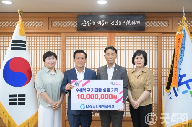 [굿타임] = 이강부 기자 = 놀뫼새마을금고는 논산시청을 방문해 수재의연금 1000만원을 기탁했다.