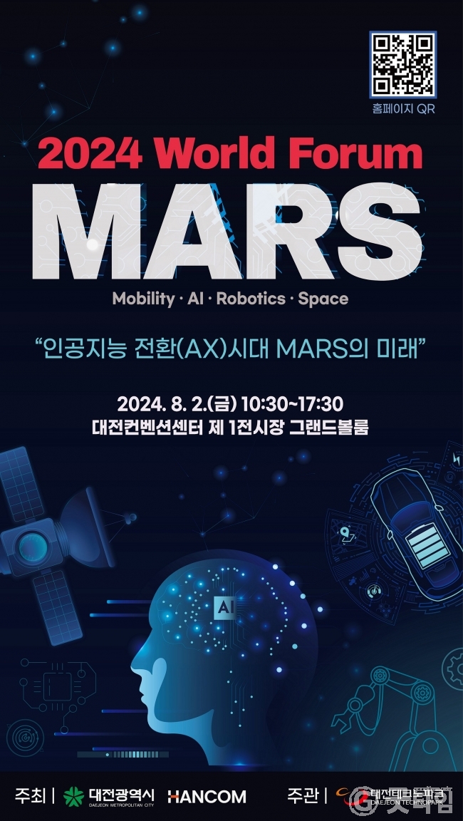 올해로 4번째인 마스(MARS)월드포럼은 대전시와 한글과컴퓨터그룹이 함께 모빌리티(Mobility), 인공지능(AI), 로봇(Robotics), 우주(Space)분야의 전문가를 초청해 특별강연 등을 진행하는 첨단기술 전문 세미나 행사다.