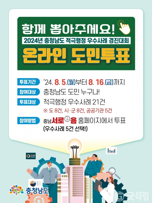 [굿타임] = 이강부 기자 = 충남도는 오는 16일까지 충남서로e음 플랫폼에서 2024 적극행정 우수사례 선정을 위한 온라인 도민투표를 진행한다.