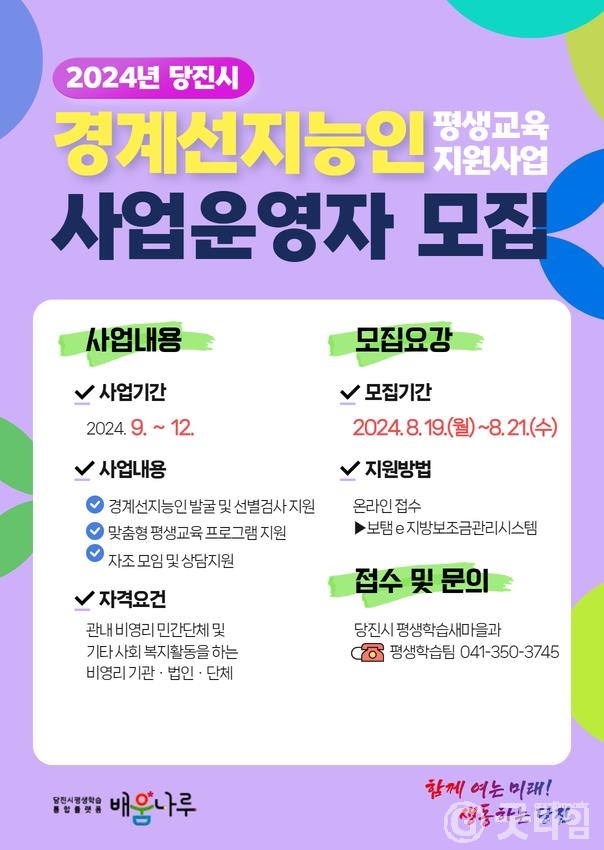 [굿타임] = 이강부 기자 = 당진시는 경계선지능인의 사회 참여 확대와 자립을 위해 오는 19일부터 21일까지 경계선지능인 평생교육 지원 사업을 수행할 보조사업자를 공모한다.