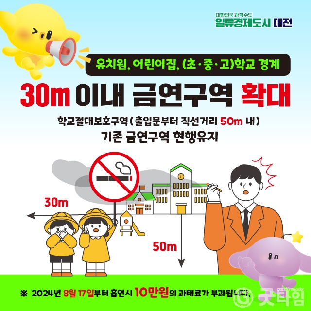 [굿타임] = 이강부 기자 = 대전시는 17일부터 어린이집, 유치원, 초중고등학교 시설의 경계선으로부터 30m 이내를 금연구역으로 확대한다.