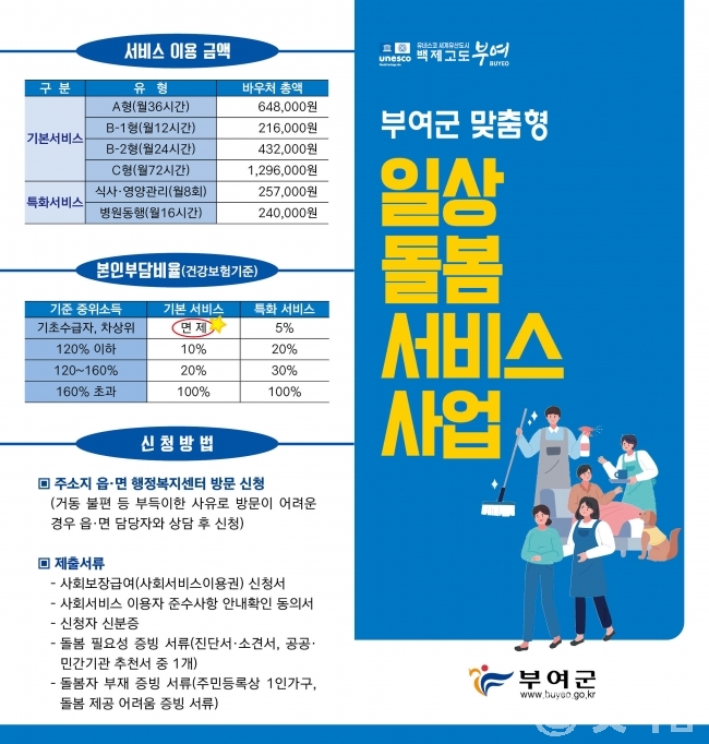 [굿타임] = 이강부 기자 = 부여군은 돌봄이 필요한 청중장년(19세부터 64세)과 가족을 돌보고 있는 청년을 대상으로 일상돌봄서비스 사업 이용자를 모집한다.
