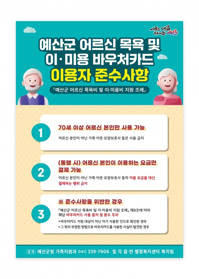 [굿타임] = 이강부 기자 = 예산군은 현재 70세 이상 어르신의 노인복지 증진을 위해 목욕비와 이미용비를 반기별 5만4000원씩 지원하는 가운데 어르신들이 바우처(이용권)카드를 올바르게 사용할수 있도록 각가맹점에 포스터를 배부하는 등 홍보를 강화할 계획이다.