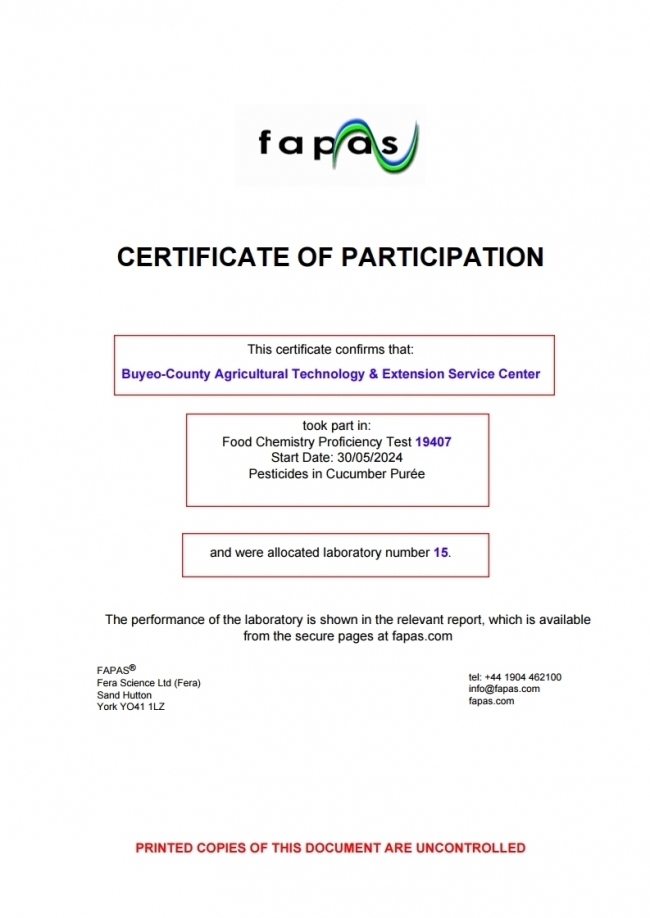 부여군 농산물안전분석실은 굿뜨래 농산물의 체계적인 안전성 분석관리를 위해 지난 5월에 국제적으로 권위 있는 해당 프로그램에 참여했으며 전세계 57개 기관중 최고 수준의 표준점수 평균 0.1 이하를 획득해 우수 분석기관으로 인정받았다.
