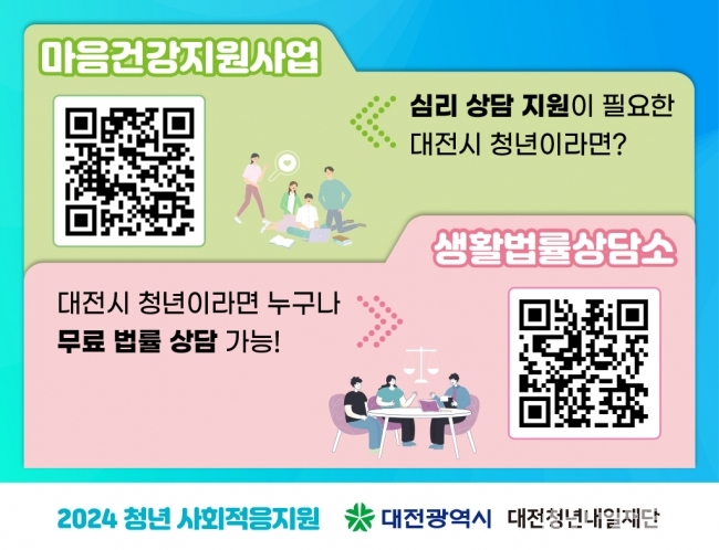 상담을 희망하는 청년들은 대전시가 지정한 전문기관에서 개인이나 집단상담 서비스를 받을수 있으며 유성구와 대덕구는 헤아려봄 심리상담센터, 동구와 중구는 희망찾기 사회적협동조합, 서구는 나우인사이드 심리상담센터에서 상담 서비스를 제공한다.
