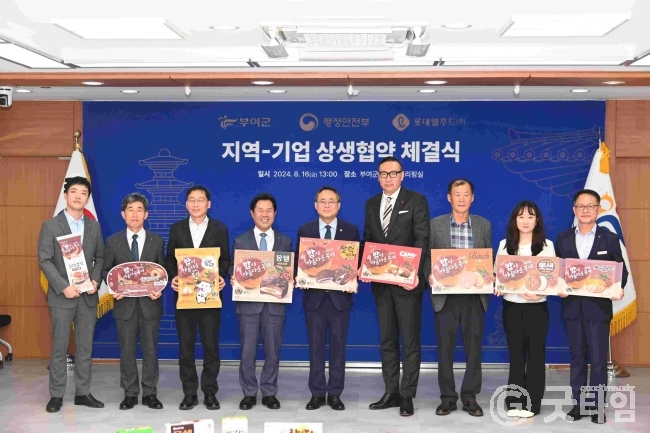 [굿타임] = 이강부 기자 = 부여군은 부여군청 서동브리핑실에서 행정안전부, 롯데웰푸드와 지역과 기업 상생발전을 위한 업무협약을 체결했다.