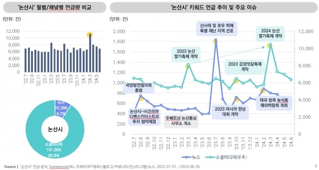 국방 군수, 농산물 수출, 문화 관광 분야의 키워드 언급량이 점차 증가하는 추세를 보이며 논산시가 민선 8기 들어 역점을 두고 추진하고 있는 주요 정책에 관한 관심도가 높아지고 있음이 드러났다.