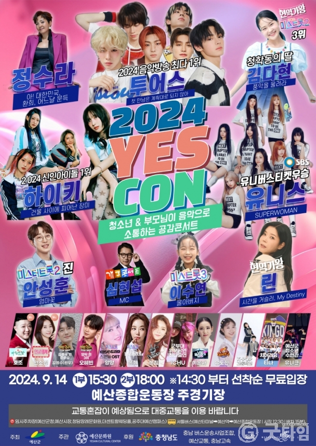 이번 콘서트는 14일 예산종합운동장 주경기장에서 청소년과 부모님이 음악으로 소통하는 공감콘서트를 주제로 오후 3시 30분부터 진행될 예정이며 입장은 2시30분부터 진행된다.