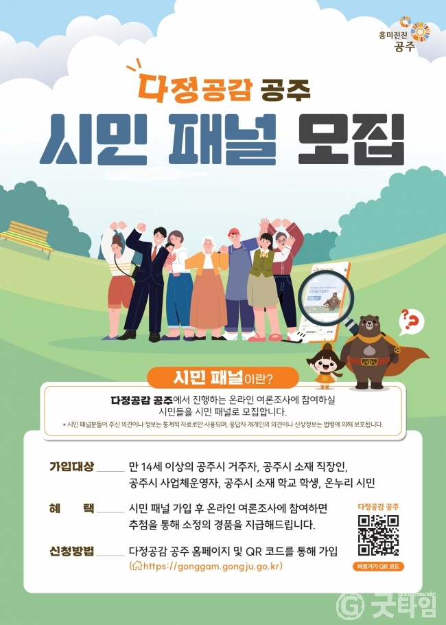 시민 패널은 다정공감 공주 누리집을 통해 상시 공개 모집하며 14세 이상 공주시민이거나 공주시 소재 직장인, 사업체운영자, 학생, 온누리 공주시민이면 누구나 가입할수 있다.