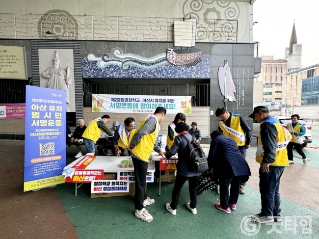 [굿타임] = 이강부 기자 = 아산시의 복지리더 행복키움추진단협의회는 온양온천역 광장에서 20여명의 회원과 함께 제2중앙경찰학교 아산 유치를 위한 서명운동을 전개했다.
