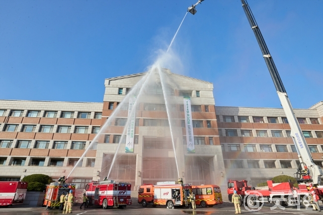 [굿타임] = 이강부 기자 = 아산시는 선문대학교 공학관에서 화재와 붕괴 같은 대규모 재난에 대한 대응 능력을 제고코자 2024 아산시 재난대응 안전한국훈련을 실시했다.