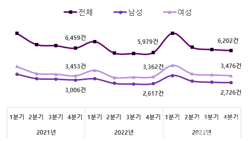 또 평균 초혼 연령은 여성 31.1세, 남성 34.0세로 매년 높아지고 있으며 2023년 4분기 여성의 구직 신청은 3476건으로 전년 같은 분기 대비 114건 증가해 매년 여성의 구직 신청이 높아지는 것을 볼수 있다.