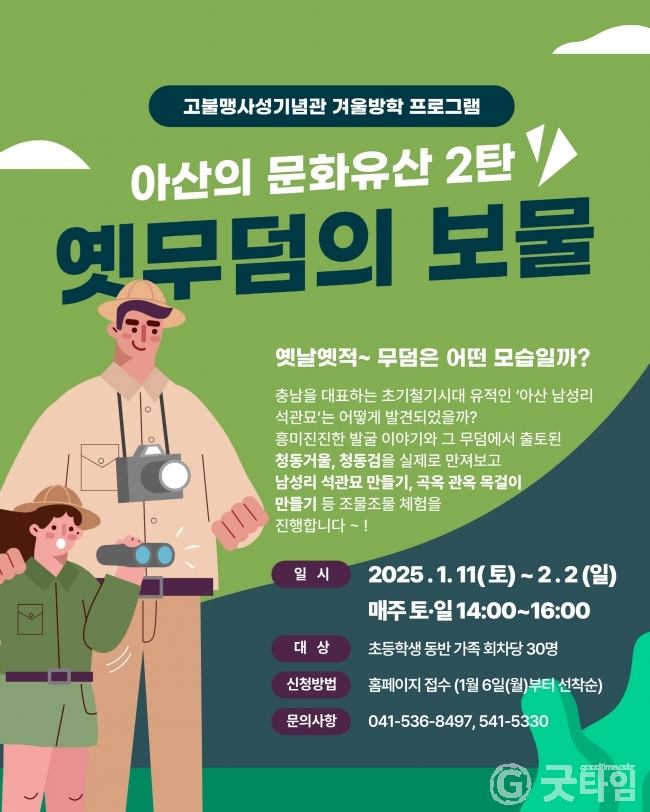 [굿타임] = 이강부 기자 = 아산시가 겨울방학을 맞아 오는 11일부터 2월2일까지 매주 토요일과 일요일 고불맹사성기념관에서 초등학생 가족 대상 프로그램을 운영한다.