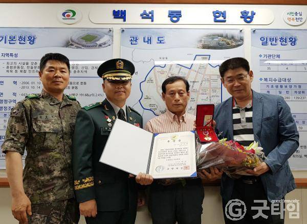 [굿타임] = 이강부 기자 = 천안시 서북구 백석동은 27일 6.25전쟁에서 큰 공을 세운 국가유공자에 화랑무공훈장을 전달하는 전수식을 가졌다.