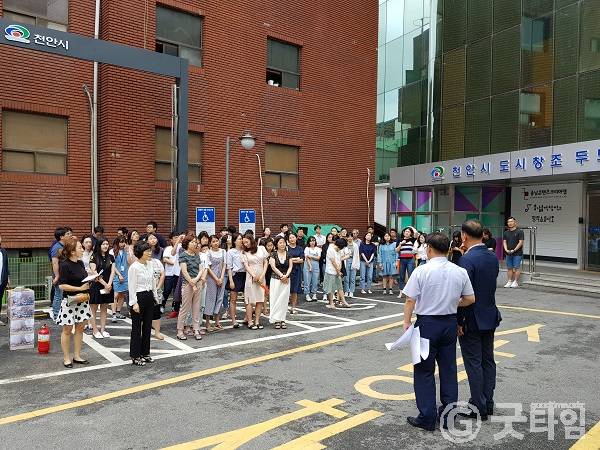 훈련은 천안시 도시창조두드림센터 자위소방대의 운용능력을 배양하고 화재 등 긴급상황 발생 시 대응능력을 높여 재난으로부터 귀중한 생명과 재산을 보호하기 위해 마련됐으며 훈련을 통해 근무자들은 화재예방 의식을 향상하고 소화기 사용법에 대한 시청각 교육과 실습 등 소방안전교육도 함께 청취해 개인별 임무와 대처 방법 등을 점검했다.