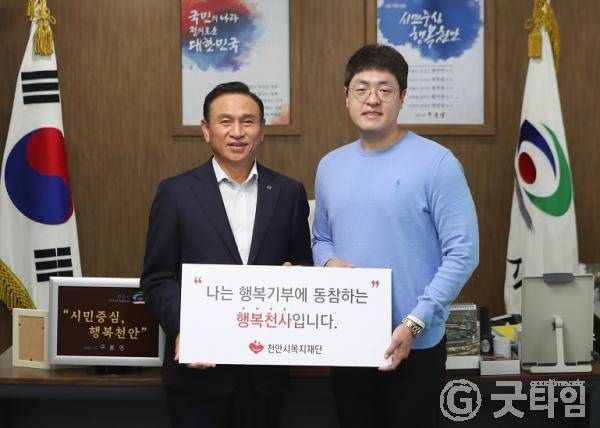 [굿타임] = 이강부 기자 = 천안시복지재단이 소규모 사회복지시설 지원을 위해 추진하는 행복천사 릴레이 캠페인에 주식회사 구공이 첫 번째 행복천사로 나섰다.