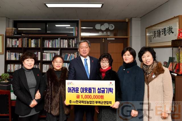 [굿타임] = 이강부 기자 = (사)한국여성농업인 부여군연합회는 12일 설명절을 맞아 힘든 겨울을 보내고 있는 어려운 이웃을 위해 이웃돕기성금 1000만원을 기탁했다.