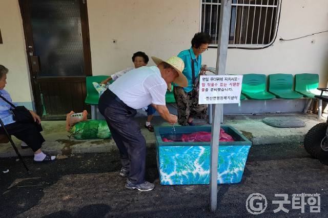 면은 산불진화차를 활용해 지난달 24일부터 매일 20여 차례 한산 시가지 도로에 살수 작업을 시행해 뜨거운 열기를 식히는가 하면 한산 공용버스 정류장에 얼음물을 비치해 주민들이 잠시나마 더위를 식힐 수 있도록 했다.
