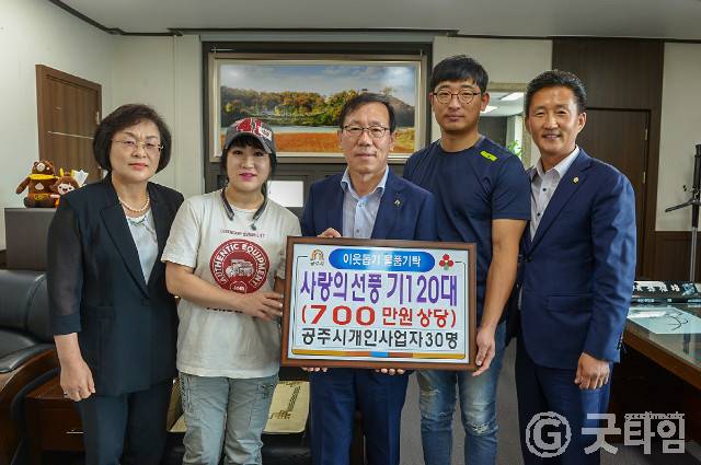 [굿타임] = 이강부 기자 = 연일 폭염으로 전국이 몸살을 앓고 있는 가운데 공주시 관내 개인사업자 사장 30명이 뜻을 모아 십시일반으로 어려운 이웃을 위한 신바람 나는 사랑의 선풍기 기증에 동참해 지역 사회를 시원하게 만들고 있다.