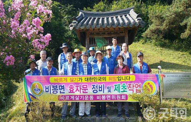 한편 바르게살기운동 비봉면위원회는 효자문 정비 외에도 기초질서와 학교폭력예방캠페인, 태극기달기캠페인, 독거노인방문 위로 등 회원들의 적극적인 참여로 지역과 함께하며 참된 봉사활동을 펼치고 있다.