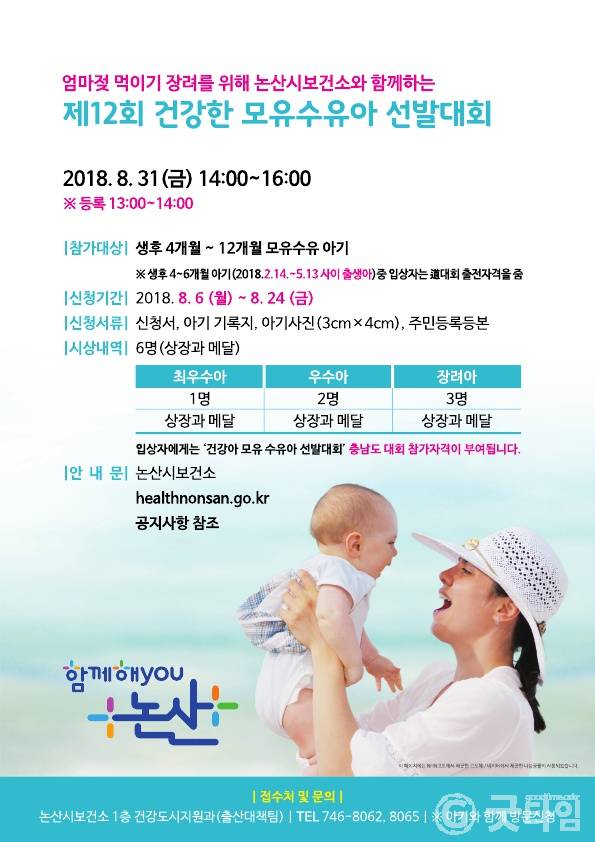 이번 행사는 모유의 우수성 홍보와 모유수유 실천 확산을 위한 취지로 참가 자격은 논산시에 거주하는 4개월부터 12개월 사이의 모유 수유아다.