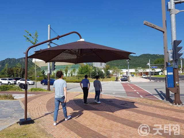 [굿타임] = 이강부 기자 = 홍성군 신도시시설관리사업소는 지속되는 폭염으로부터 보행 주민들을 보호하기 위해 그늘막을 시범 설치 운영 중이다.